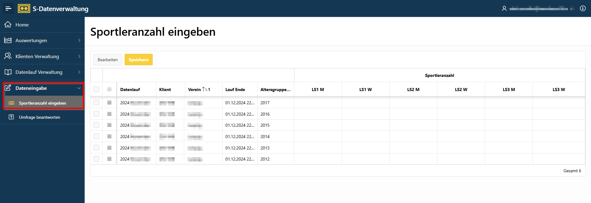 Die Sportlerzahlen für die 3 Leistungsstufen (LS), welche vom Ihren Verband beschrieben sind können hier eingegeben werden. Nach dem Bearbeiten bitte "Speichern" drücken.